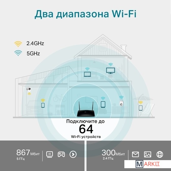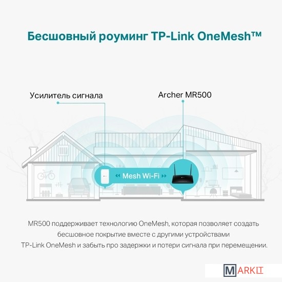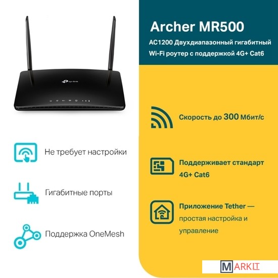 Общий доступ к сети 4G LTE для множества Wi-Fi устройств - скорость загрузки до 150 Мбит/сМощные встроенные антенны обеспечивают стабильное подключение к Wi-Fi и широкое покрытиеНе требует настройки - вставьте SIM-карту и включите маршрутизатор для высокоскоростного доступа в интернетПозволяет одновременно создавать две сети Wi‑Fi со скоростью до 300 Мбит/с на 2,4 ГГц и 433 Мбит/с на 5 ГГцРезервное подключение по 3G/4G при отсутствии подключения по кабелю EthernetПоддержка OneMesh — используйте усилители OneMesh, чтобы создать покрытие во всём доме и не терять сигнал при перемещении