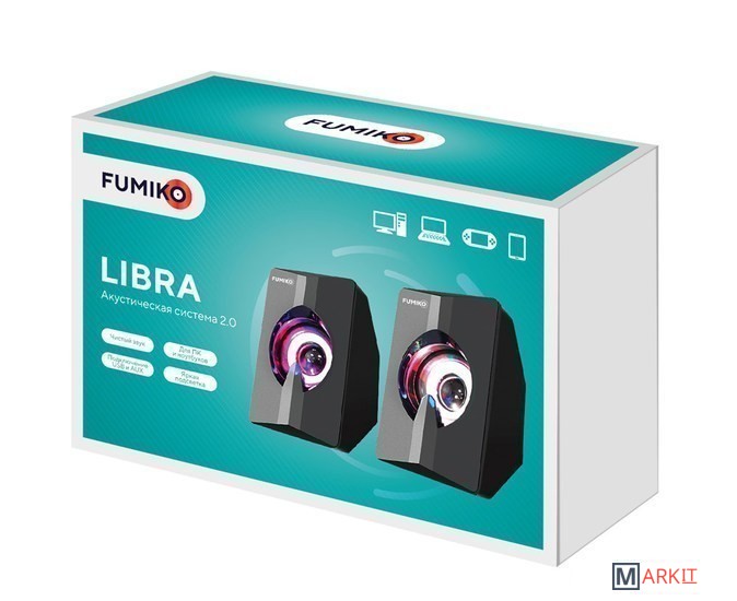 Колонки 2.0 - отличное решение для каждого, кому важен качественный и чистый звук. Модель FUMIKO LIBRA отлично подходит как для прослушивания музыки, так и для просмотра фильмов. Компактное устройство особенно пригодится владельцам ноутбуков, встроенные динамики которых не способны выдать достаточную мощность и громкость. Новейшие технологии в производстве комплектующих позволили достичь хорошего уровня громкости и чистоты звучания. С источником звука они соединяются с помощью кабеля с разъемом 3.5 мм Jack. Питание происходит от USB - больше никаких лишних проводов. Любимая музыка в громком звучании теперь всегда будет с вами. Длина кабеля позволяет подключить колонки к разъемам на задней панели персонального компьютера.Общая длина провода 105 смРегулировка громкости на проводеС подсветкой