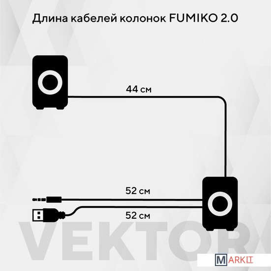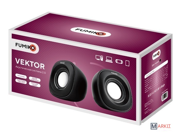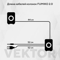 Колонки 2.0 - отличное решение для каждого, кому важен качественный и чистый звук. Модель FUMIKO VEKTOR отлично подходит как для прослушивания музыки, так и для просмотра фильмов. Компактное устройство особенно пригодится владельцам ноутбуков, встроенные динамики которых не способны выдать достаточную мощность и громкость. Новейшие технологии в производстве комплектующих позволили достичь хорошего уровня громкости и чистоты звучания. С источником звука они соединяются с помощью кабеля с разъемом 3.5 мм Jack. Питание происходит от USB - больше никаких лишних проводов. Любимая музыка в громком звучании теперь всегда будет с вами. Длина кабеля позволяет подключить колонки к разъемам на задней панели персонального компьютера.Длина кабеля с разъемом 3.5 мм Jack - 52 смДлина кабеля с разъемом USB - 52 смДлина провода между колонками 44 см