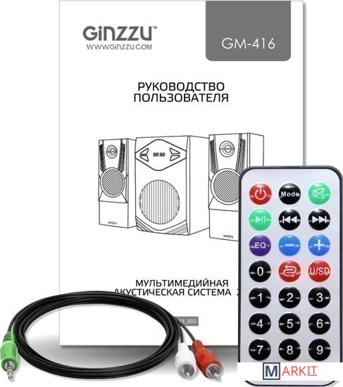 - пульт ДУ- аудиокабель (3.5 мм - 2RCA)- документация |