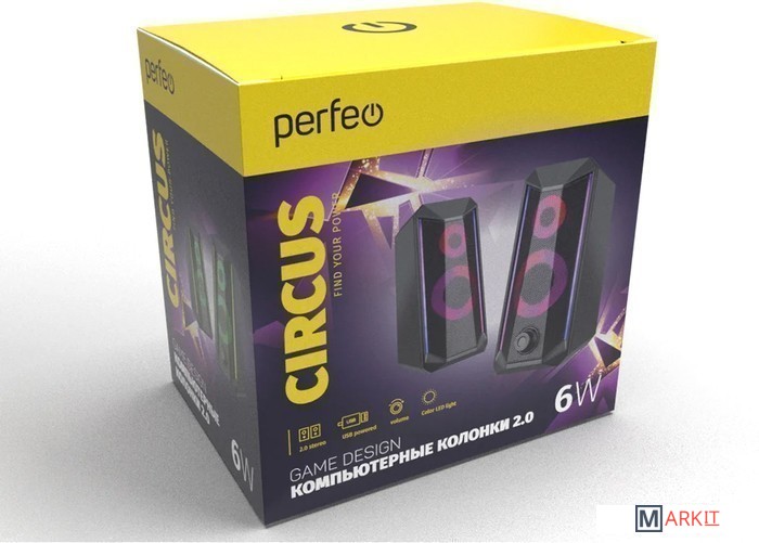 Колонки "CIRCUS" оснащены стандартным 3,5-мм аудиоразъёмом, что даёт возможность подключения колонок к любому совместимому аудиоустройству - ноутбуку, смартфону, планшету, монитору, телевизору, MP3 плееру. Колонки "CIRCUS" подключаются к источникам звука посредством имеющегося кабеля с USB разъёмом, через который колонка и получает питание. Также колонки можно запитать от Power Bank'a или через сетевой адаптер.Общая мощность колонок 6 Вт. Это, конечно, не позволяет поставить её в один ряд с полноценными мощными и дорогими аудиосистемами, но вполне способна обеспечить яркое и приятное звучание за приемлемую стоимость, простоту подключения и использования, а также за стильный внешний вид и небольшие габариты.Регулятор на передней панели одной из колонок позволит вам настроить комфортный уровень громкости звука, а RGB-подсветка сделает их настоящим украшением персонального рабочего места. Особенно это оценят дети и взрослые, которые увлекаются компьютерными играми.