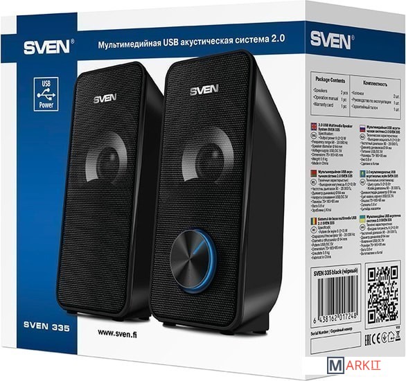 Мультимедийная USB акустическая система SVEN 335 предназначена для воспроизведения музыки и озвучивания игр, фильмов и проч. Акустика имеет встроенные усилитель, а также акустический и сигнальный кабели, благодаря чему может быть подключена к ПК, ноутбуку, МР3 или CD-плееру либо другим источникам звука. Питание АС осуществляется через USB-порт ПК, ноутбука или блока 5V DC с помощью встроенного USB-кабеля электропитания.