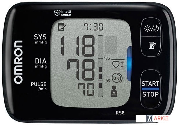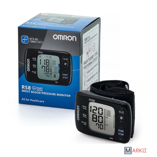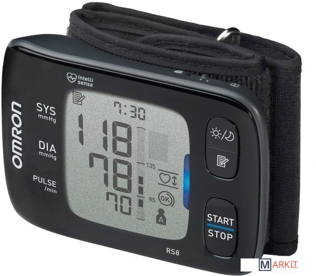 OMRON RS8 - тонометр на запястье без возрастных ограничений и с контролем правильного положения руки.Основные преимущества:Благодаря запатентованной технологии Intellisense, тонометры на запястье OMRON не имеют возрастных ограничений.Индикатор положения прибора APS позволяет определить, находится ли прибор в правильном положении относительно сердца.Расчет среднего значения: пациентам с гипертензией рекомендовано опираться не на одно измерение, а на среднее значение из трех, сделанных с интервалом не менее 1-2 минут.Индикатор аритмии сработает при любых нарушениях сердечного ритма.Он идеально подойдет людям, у которых измерение на плече вызывает резкие болезненные ощущения.Легкость и компактность позволяет взять тонометр с собой на работу, на дачу или в путешествие.Память по 100 измерений для двух пользователей.Футляр для того, чтобы взять тонометр в дорогу.Каждый тонометр OMRON в процессе производства трижды проходит контроль точности, что обеспечивает надежную работу прибора.