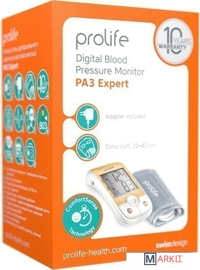 Prolife PA3 Expert – автоматический тонометр для измерения давления и пульса с технологией Comfort Sense. Процесс измерения давления персонализирован, тонометр изменяет силу сдавливания и интенсивность накачивания манжеты, адаптируя ее под каждого пользователя. Это позволяет сделать измерение давления комфортным и избежать значительных болевых ощущений. Прибор оснащен индикатором нарушения сердечного ритма: если в процессе измерения у пользователя выявлена аритмия – на экране тонометра появляется соответствующий символ. Полученный при этом результат измерения давления – точный и достоверный.Благодаря комфортному процессу измерения и высокой точности результатов этот тонометр является прекрасным вариантом для ежедневного контроля за уровнем артериального давления.Сетевой адаптер в комплекте.