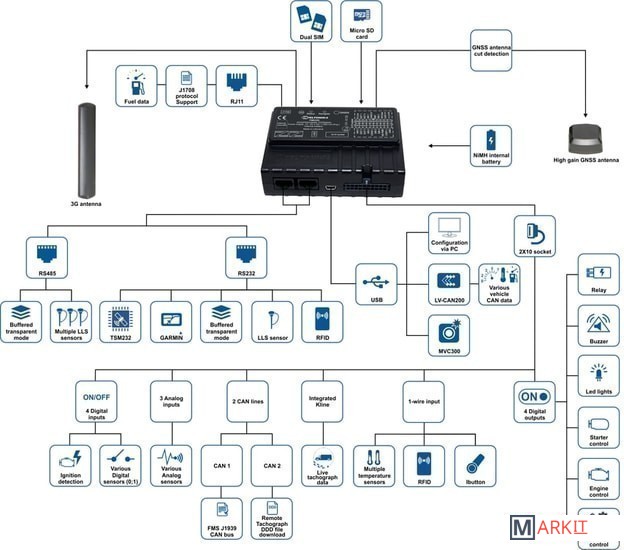 - Встроенный 3G/GSM модуль для применения по всему миру, даже в тех странах, где доступен только 3G стандарт. Контролируемое переключение между 3G и GSM-сетями- Прост в подключении и установке- 2 индикатора LED- Встроенная перезаряжаемая батарея Ni-MH- Отслеживание в режиме реального времени- Внешняя 3G/GSM-антенна для обеспечения постоянного приёма/передачи данных даже в местах, где сигнал сотовой связи слабый- Внешняя ГНСС-антенна для корректного определения местоположения объекта даже в сложной окружающей обстановке: городская застройка, низины, густые леса- Сбор данных основан на: — Время — Расстояние — Угол — Изменения скорости (значения берутся от GPS или CAN-адаптера Teltonika) — Зажигание или другое событие ввода/вывода- Сохранение информации на Micro SD-карту, что позволяет предотвратить потерю данных во время отсутствия GSM/3G- Передача полученных данных по 3G или GPRS (TCP/IP и UDP/IP протоколы)- Виртуальный одометр- 2х CAN J1939 — возможность чтения и удалённой загрузки DDD файлов- J1708: считывает данные с CAN-шины- RS485 и 2x RS232 интерфейсы для современных систем учёта топлива или подключение внешних устройств таких, как: Garmin, LLS, RFID-считыватель и т.п.- Экономия энергопотребления в режимах Sleep или Deep Sleep- Аутентификация водителя. Максимально: до 500 ключей dallas iButton- Синхронизация времени по NTP (Network Time Protocol), если ГЛОНАСС/GPS-сигнал отсутствует- Приём/отправка SMS по GPRS- Выбор часовых поясов (UTC/GMT)- Отправка SMS по событиям- Teltonika CAN-адаптер.