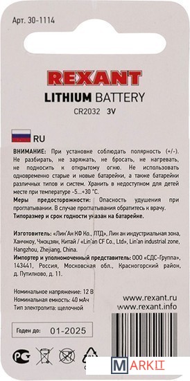 Markit » Батарейки, аккумуляторы, зарядные » Батарейка Rexant CR2032 30-1114