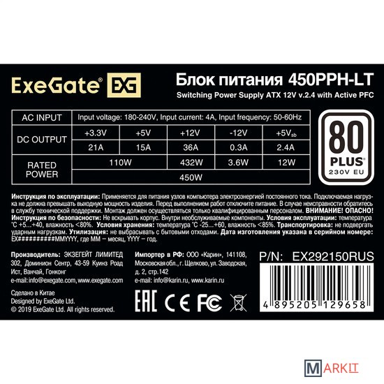 Markit » Блоки питания » Блок питания ExeGate 450PPH-LT 80 Plus EX292150RUS