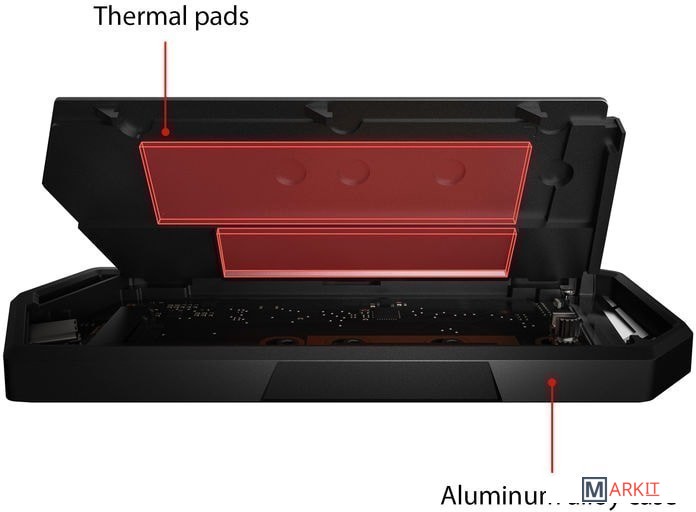 ROG Strix Arion (ESD-S1C) – это контейнер для установки NVMe-накопителей форм-факторов 2230/2242/2260/2280. Он подключается к компьютеру по интерфейсу USB-C 3.2 Gen2 с пропускной способностью до 10 Гбит/с. Алюминиевый корпус с термопрокладками способствует хорошему охлаждению установленного устройства, а встроенная подсветка Aura помогает создать красочную геймерскую атмосферу. К контейнеру прилагается защитный чехол с карабином в виде буквы R.Контейнер ROG Strix Arion (ESD-S1C) изготовлен из алюминиевого сплава. Благодаря термопрокладкам он выступает в роли радиатора, охлаждающего установленный в него твердотельный накопитель, что помогает избежать перегрева и последующего падения производительности.