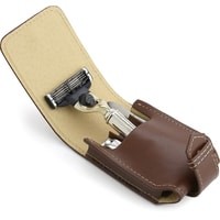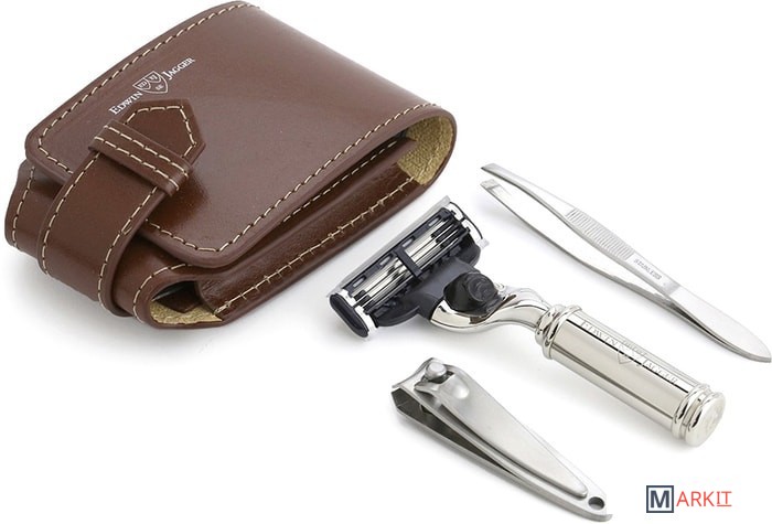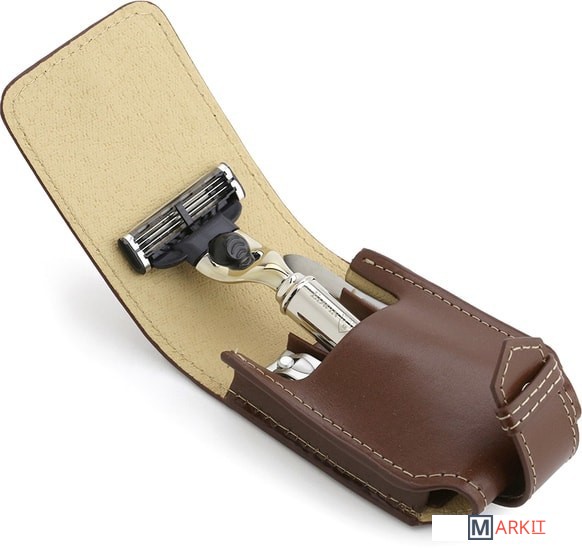 Дорожный бритвенный набор Edwin Jagger RT4M3 состоит из бритвенного станка с системой Mach3, пинцета, клиппера для стрижки ногтей и коричневого чехла из натуральной кожи. Бритва имеет никелированную ручку, благодаря этому имеет высокую коррозийную стойкость и эффектный внешний вид. Все предметы уложены в стильный итальянский кожаный чехол. Идеальный бритвенный набор для путешествий или деловых поездок.