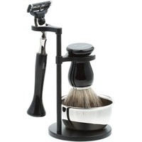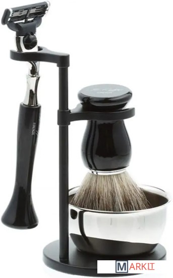 Бритвенный станок, совместимый с кассетами Gillette MACH3 (одна кассета в комплекте).Помазок с барсучьим ворсом.Металлическая чаша.Подставка из металлического сплава.