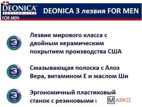 Бритва для мужчин с 3 лезвиями мирового класса произведена в США. Технология 3 лезвийной бреющей поверхности мужской бритвы Deonica легко срезает волоски, делая бритье максимально комфортным. Следует контурам твоего лица для лучшего бритья. Всего одно движение бритвой для невероятно чистого бритья и шелковистой гладкости кожи. Лезвия для бритвы имеют двойное керамическое покрытие, что гарантирует более точное и чистое бритье. Гипоаллергенная смазывающая полоска с Алоэ Вера, витамином Е, маслом Ши и Жожоба нежно ухаживает за кожей и обеспечивает безупречное скольжение. Пластиковая рельефная ручка CLASSIC имеет резиновые вставки для удобного обхвата ручки. Станок для бритья не будет выскальзывать у вас из рук. Уникальная система бритвенных станков Deonica позволяет использовать любые кассеты для бритвы Deonica на 3, 5 или 6 лезвий. Бритвенная серия Deonica это гладкое и комфортное бритье без раздражений даже на самой чувствительной коже!