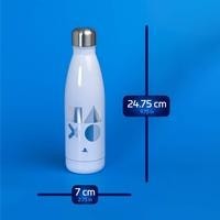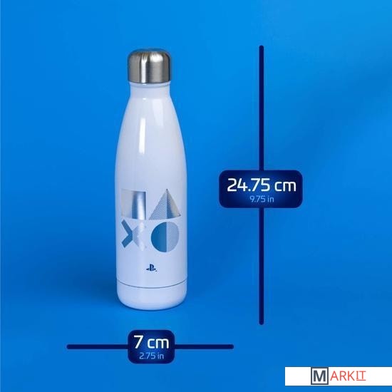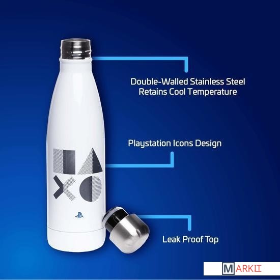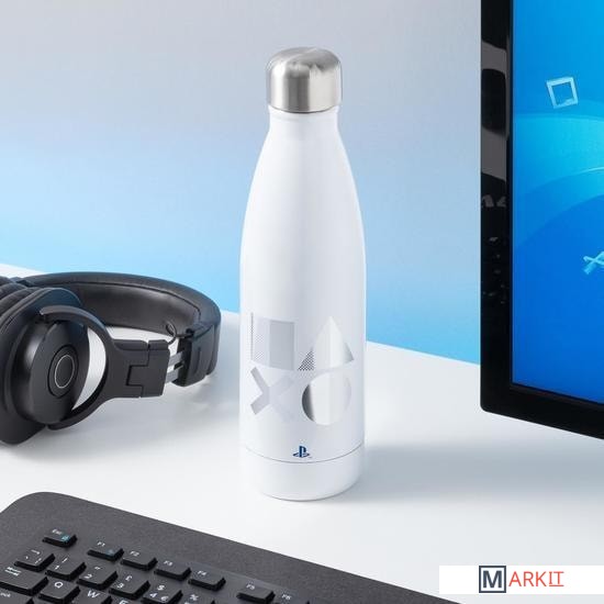 Эта лицензированная бутылка для воды из нержавеющей стали с двойными стенками прекрасно подходит для утоления жажды вне дома и легко помещается в сумке, рюкзаке или подстаканнике в машине. Белый корпус, подходящий как для горячих, так и для холодных напитков, украшен синим логотипом PlayStation и серебристыми знаками кнопок действий — треугольником, кругом, крестом и квадратом. Закручивающаяся матовая крышка предотвращает проливание. Не предназначена для использования в микроволновой печи и посудомоечной машине.