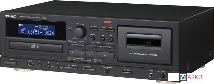 Комбинированное устройство TEAC AD-850, выполненное в классическом для Hi-Fi-техники форм-факторе, объединяет в одном корпусе проигрыватель CD-Audio и кассетную деку. Этот аппарат способен удовлетворить запросам многих меломанов, которые бы хотели приобщится к популярному в 80-е годы формату аналоговой магнитной записи, а также тех, кто еще имеет в своем распоряжением компакт-кассеты с музыкальными записями.Однако на этом возможности TEAC AD-850 не заканчиваются. Аппарат оснащен также USB-разъемом, с помощью которого можно производить оцифровку композиций, имеющихся на компакт-кассетах и их запись на подключенный флеш-накопитель. Кассетная панель в TEAC AD-850 также пишущая, позволяющая записывать музыку с CD или USB-накопителей. Очень интересной дополнительной опцией в устройстве является гнездо для подключения микрофона. Для него в плеере можно включить режим реверберации (эха), благодаря чему аппарат превращается в настоящую караоке-машину. Предусмотрен в TEAC AD-850 и линейный аналоговый вход.Двухголовочная кассетная дека может работать с лентой трех основных типов, имеет точную регулировку скорости и удобное управление всеми транспортными функциями. USB-гнездо в TEAC AD-850 предназначено не только для записи, но и воспроизведения музыкальных файлы. Подмешивание микрофонного сигнала в режиме воспроизведения возможно к любому из трех встроенных источников сигнала, а запись возможна во всех случаях кроме режима копирования с CD на USB-флешку. Также в режиме записи на касссету можно воспользоваться ручной регулировкой уровня сигнала.
