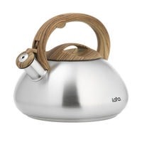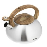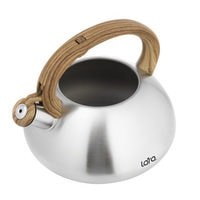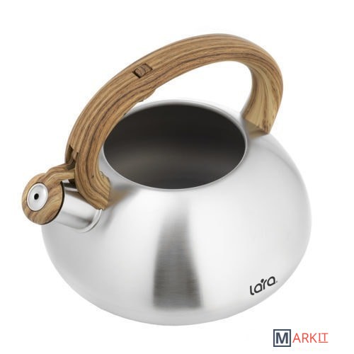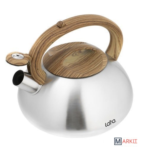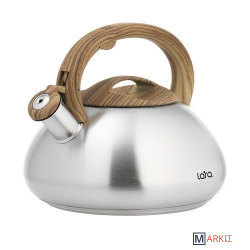 Современный чайник LARA, с дизайном округлой формы и сатинированной отделкой корпуса, станет Вашим незаменимым помощником на каждый день. Установленный свисток не позволит пропустить момент закипания воды и Вы всегда будете контролировать процесс. Отличного чаепития! Для чайника применены экологически чистые и безопасные материалы: для корпуса использована высококачественная нержавеющая сталь марки AISI201, эргономичная ручка и крышка выполнены из ненагревающегося нейлона с имитацией рисунка древесины и покрытием «Soft-touch». Индукционное капсулированное дно подходит для плит всех типов. Свисток с безопасным кнопочным механизмом на ручке.