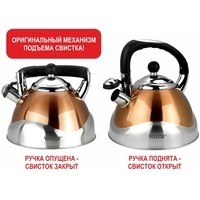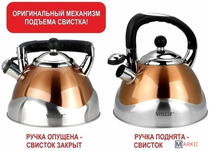 Оригинальный механизм подъема свистка: свисток поднимается, когда ручка чайника находится в вертикальном положении.