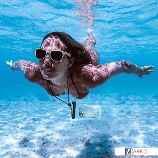 Универсальный водонепроницаемый чехол для плавания. Оснащен защитой IPX8 и нашейным шнурком с регулировкой длины.