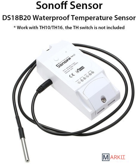 Датчик использует интерфейс 1-Wire, разработанный компанией Dallas. Данный интерфейс широко распространен и довольно прост в использовании. Данный датчик является дополнением (опцией), для использования с устройствами Sonoff TH10/TH16 и снабжен специальным разъемом для подключения к этим устройствам.Датчик должен быть подключен к Sonoff TH10/TH16, до включения питания модуля. Не рекомендуется подключать или отключать датчик после включения питания.- Корпус: нержавеющая сталь (водонепроницаемый);- Разъем: jack 2,5мм.;- Напряжение питания: 3.0-5.5В (рекомендуемое 5В);- Диапазон температур: -55°C..+125°C;- Точность показаний температуры: 0.5°С;- Шаг показаний: 0.0625°С;- Интерфейс: 1-Wire;- Потребляемый ток: 1мА;- Длина (кабель с датчиком): 1 метр;- Максимально расширяемая длина: 8 метров;