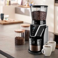 Кофемолка отличается высокой производительностью в 165 Вт, и за 1 цикл работы способна измельчить до 100 г продукта! Даёт равномерный помол и не перегревает кофе в отличие от роторных кофемолок. Нескользящие ножки делают прибор устойчивее на поверхности.У кофемолки есть LED-дисплей и сенсорное управление, что делает устройство удобным в использовании. Дисплей показывает время работы, количество чашек до 10 порций и таймер на 40 секунд. Сверху находится регулятор, где можно настроить степень помола.Длина шнура: 0.8 м.