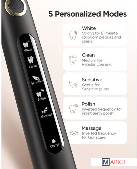 Инновационная звуковая технология лучше очищает зубы, делая улыбку ярче и белее. Электрическая зубная щетка с 40000 колебаний в минуту обеспечивает тщательную очистку и снижает уровень шума. 5 режимов работы не только удовлетворят разнообразные потребности, но и добавят удовольствия в вашу ежедневную рутину. Прибор имеет одобрение от Американской Ассоциации Стоматологов (ADA).
