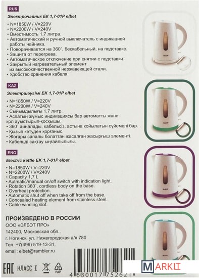 Markit » Электрочайники и термопоты » Электрический чайник ЭлБЭТ EK 1.7-01P (белый/фиолетовый)