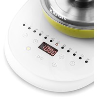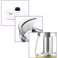 Электрический чайник с сенсорным управлением КТ-6130 является универсальным прибором для приготовления не только напитков, но и пищи. Помимо кипячения, прибор греет воду до заданной t, а также имеет специальные программы для приготовления различных блюд.Чайник греет воду от 40 до 100 °С с шагом 5 °С, что очень удобно при заваривании разных сортов чая или приготовления детского питания. Вы можете настроить необходимую t сами либо выбрать для этого режим (травяной, ароматизированный или черный чай).В комплекте идёт чаезаварочный фильтр для заваривания чая прямо в чайнике. Вам нужно только засыпать листья в фильтр, залить воду и выбрать t или режим. Фильтр легко снимается, моется и устанавливается обратно.У КТ-6130 имеется 11 предустановленных программ приготовления различных блюд и напитков: варка супа, каши, спагетти, круп, подогрев молока и тд. Также есть функция поддержания t и автозапуска, которые можно использовать одновременно.В комплекте идёт подставка для 6 яиц, а у чайника есть специальный режим для их варки. Программа доводит воду до кипения, а затем поддерживает кипение, нагревая воду на мощности 500 Вт в течение 8 минут.На подставке расположена панель управления, кнопки вкл/выкл, кнопки выбора программ, кнопки включения и поддержания t и автозапуска, а также LED-дисплей. На ярком дисплее отображается t воды и время.Чайник КТ-6130 отлично подойдёт для тёплых встреч с семьёй и друзьями. За один раз в чайнике можно вскипятить до 1,8 л воды. Этого хватит, чтобы приготовить горячие напитки на большую семью. Ручка чайника пластиковая, не нагревается и удобно лежит в руке.Корпус и крышка чайника выполнены из стекла, а подставка – из сочетания стекла и пластмассы. Мерная шкала нанесена на прозрачную часть корпуса. Съемная крышка и широкое горлышко облегчает доступ внутрь при мойке и во время удаления накипи.Подставка с центральным контакт даёт возможность располагать на ней чайник в любом положении, обеспечивая вращение на 360°. Имеется защита при закипании, при включения чайника без воды.