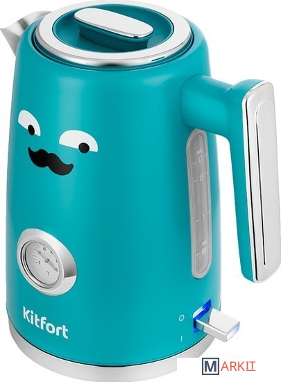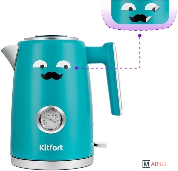 Стильный чайник Kitfort КТ-6144 выполнен из сочетания нержавеющей стали и пластика. За счёт оригинального дизайна он идеально впишется в любой интерьер. Ёмкость чайника составляет 1,7 л.Чайник имеет встроенный термометр, выполненный в винтажном стиле. Это очень удобно для заваривания различных напитков, для которых требуется определённая температура воды. Например, зелёный чай, белый чай, кофе и тд.Специальная форма носика позволяет точно наливать воду в чашку без расплёскивания и брызг и быстро наполнять её. В носике чайника расположен съёмный фильтр, который задерживает частички накипи и предотвращает их попадание в чашку.Чайник оснащён контроллером Strix - № 1 среди поставщиков компонентов для электрочайников. Он устраняет риски короткого замыкания и возгорания прибора. Обеспечивает защиту при закипании, при включении чайника без воды.Крышка чайника полностью съёмная. Это удобно для залива воды и очистки чайника.Мерная шкала, расположенная под ручкой чайника позволяет легко следить за уровнем воды. В кнопку включения/выключения встроен индикатор нагрева. Ручка пластиковая, не нагревается и удобно лежит в руке.С нашей техникой очень легко подружиться, потому что она не только лёгкая и функциональная, но и будто живая с весёлыми глазами. В любой момент вы можете отклеить этот стикер без вреда для поверхности.