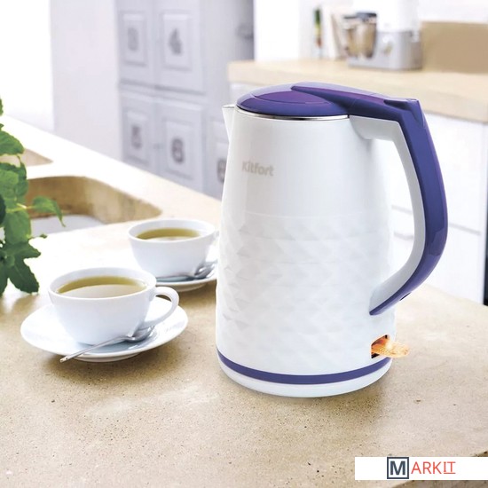 Мощный и вместительный чайник Kitfort КТ-6170 отлично подойдёт для тёплых встреч с семьёй и друзьями. За один раз в чайнике можно вскипятить до 1,5 л воды. Этого хватит, чтобы приготовить горячие напитки на большую семью.Корпус чайника выполнен из пластика, а внутренняя поверхность из металла, благодаря чему вода не соприкасается с пластиком. Мерная шкала находится внутри корпуса. Чайник имеет большое горлышко, что облегчает доступ внутрь при мытье.В кнопку включения/выключения встроен индикатор нагрева. При включении чайника загорается подсветка индикатора работы. Ручка чайника пластиковая, не нагревается и удобно лежит в руке. Полный чайник закипает за 6 минут.Подставка с центральным контактом дает возможность располагать на ней чайник в любом положении, обеспечивая вращение на 360°. Снизу имеется отсек для хранения шнура, в который можно смотать излишки шнура электропитания, чтобы он не мешал на столе.Ажурный рисунок на корпусе устройства дополнительно придаёт чайнику более изысканный вид.Украсьте вашу кухню ярким чайником и веселыми разговорами за чашечкой чая! Данная модель КТ-6170 легко впишется в любой интерьер благодаря своему необычному дизайну.