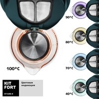 Электрический чайник с электронным терморегулятором Kitfort KT-640 может не только вскипятить воду, но и нагреть ее до температуры 40, 70, 80 и 90 °С, что очень удобно при заваривании различных сортов чая. Температура 40 °С пригодится для приготовления детского питания. Чайник также оснащен функцией поддержания температуры. Температура воды контролируется встроенным в дно чайника термодатчиком.