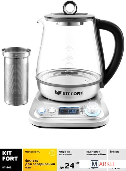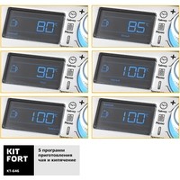 Электрический чайник с терморегулятором и электронным управлением Kitfort КТ-646 не только кипятит воду. Он имеет 10 режимов работы, в том числе 5 программ приготовления чая, для каждого сорта чая предустановлена своя температура нагревания воды: зеленый (80 °С), черный (100 °С), белый (85 °С), улун (90 °С) или травяной (100 °С). Есть программа приготовления йогурта (42 °С) и программа подогрева детского питания или молока (55 °С), а также пользовательский режим, в котором можно выставить свои температуру (40-100 °С) и время приготовления (от 1 минуты до 1 часа). Предусмотрен режим отсрочки включения (отложенный старт): от 3 до 24 часов.