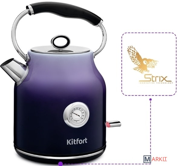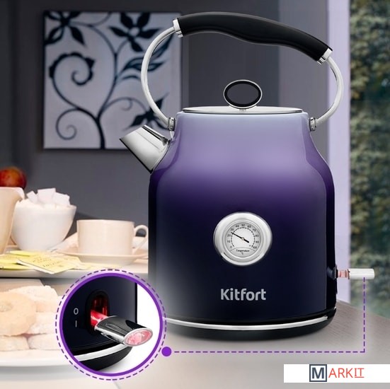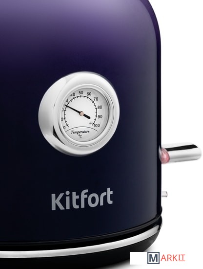 Чайник Kitfort КТ-679 имеет встроенный термометр, выполненный в винтажном стиле. Это очень удобно для заваривания различных напитков, для которых требуется определённая температура воды. Например, зелёный чай, белый чай, кофе и тд.