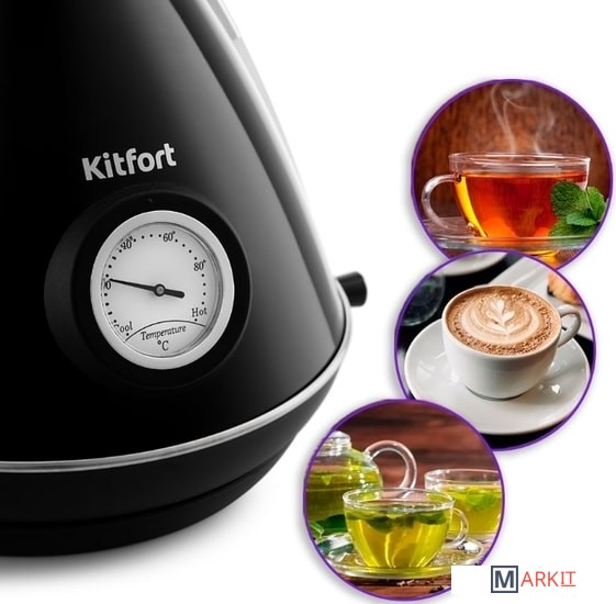 Чайник Kitfort КТ-686 имеет встроенный термометр, выполненный в винтажном стиле. Это очень удобно для заваривания различных напитков, для которых требуется определённая температура воды. Например, зелёный чай, белый чай, кофе и тд
