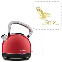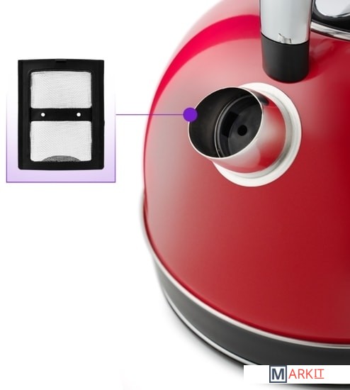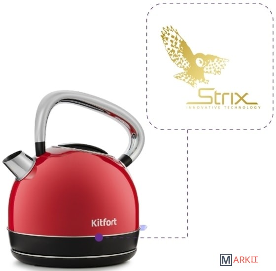 В носике чайника расположен съёмный фильтр, который задерживает частички накипи и предотвращает их попадание в чашку.Чайник оснащён контроллером Strix. Он устраняет риски короткого замыкания и возгорания прибора. Обеспечивает защиту при закипании, при включении чайника без воды и при снятии с базы во время работы.