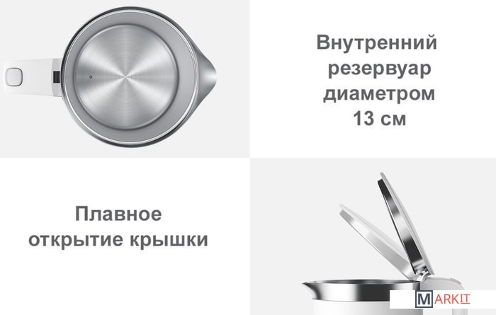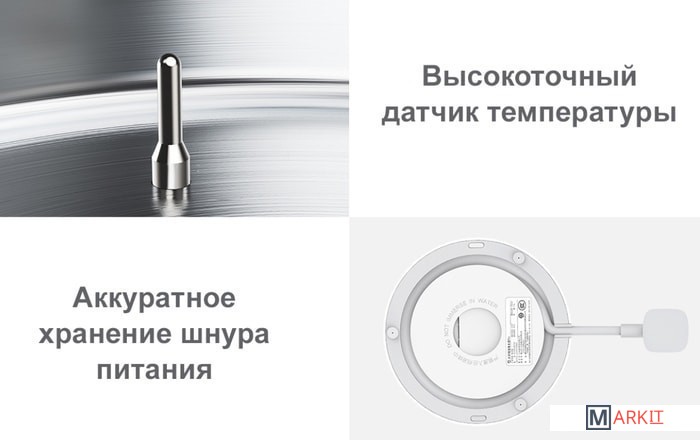Эффект термоса;Цельная литая колба;Безопасность: блокировка крышки, блокировка включения без воды;Беспроводное соединение: Bluetooth 4.0 BLE;Взаимодействие с мобильным приложением: Mi Home;Отсек для шнура;Китайская вилка.