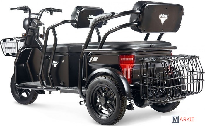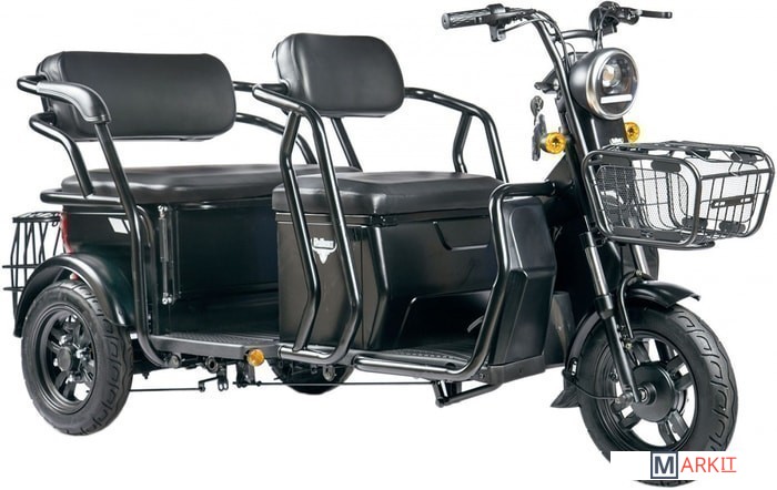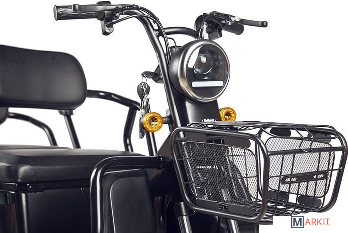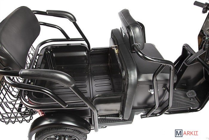 Обратите внимание! Трицикл по умолчанию поставляется без аккумуляторных батарей! Универсальный контроллер 48V/60V;Большая металлическая корзина на руле;Огромная задняя корзина;Максимум функциональности: задний "диван" трансформируется в грузовой кузов;Вместительное багажное отделение под откидывающимся сиденьем;Светодиодная оптика и поворотники;Переключатель динамики старта (резкий/плавный);Большой LCD-дисплей;Сигнализация (два брелока в комплекте).