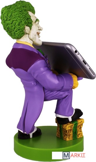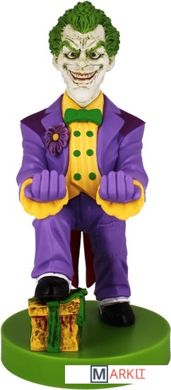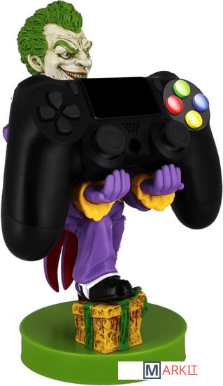 Фигурка-держатель для смартфона, портативной приставки или геймпада. Джокер (c англ. Joker — шутник, балагур) — суперзлодей вселенной DC Comics, главный и заклятый враг Бэтмена. Джокер носит фиолетовый костюм и сражается при помощи предметов, которые стилизованы под реквизит клоуна и иллюзиониста.Биллу Фингеру, Бобу Кейну и Джерри Робинсону приписывают создание Джокера, но их мнения о задумке персонажа различаются, каждый из них выдвинул свою версию событий. По утверждениям Фингера, Кейна и Робинсона, Фингер предложил взять за основу образа Джокера персонажа Гуинплена (человек с обезображенным лицом, на котором постоянно появляется улыбка) в исполнении Конрада Фейдта из фильма «Человек, который смеётся», а Робинсон сделал набросок игральной карты с лицом Джокера.Прошлое Джокера остаётся покрытым тайной до сих пор, несмотря на восьмидесятилетнюю историю персонажа. DC продолжает придерживаться теории Алана Мура о многовариантном прошлом зловещего клоуна. Возможно, даже сам Джокер уже не помнит, кем он был до той ночи, когда он надел Красный Колпак. По признанной канонической версии человек, ставший Джокером (возможно, он был неудачливым комедиантом, а возможно, и гангстером), упал в кислоту, испугавшись Бэтмена, когда в костюме Красного колпака участвовал в ограблении карточной фабрики. В результате он сошёл с ума, обрёл белую кожу, чёрные круги вокруг глаз и зелёные волосы, а на лице у него навсегда застыла улыбка.
