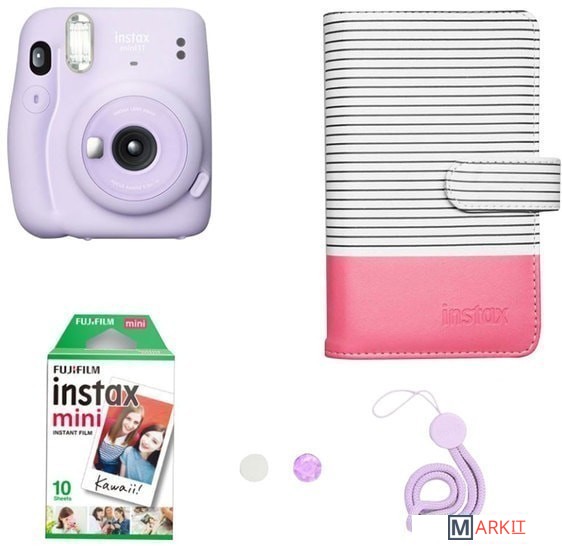 - фотопленка Instax Mini (10 снимков)- две кнопки спуска затвора- шнурок на запястье- жесткий чехол- документация |