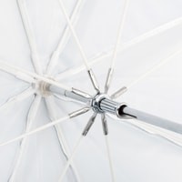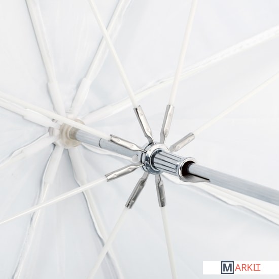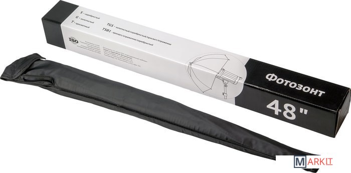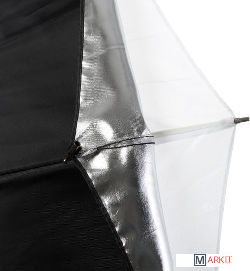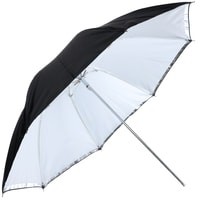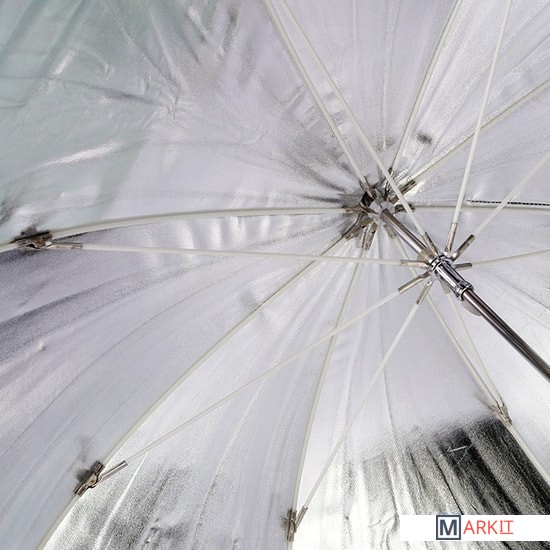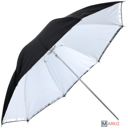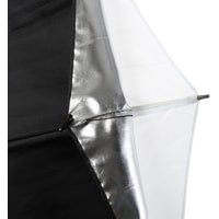 Falcon Eyes URK-48TSB1 – комбинированный зонт 2 в 1: просветный/серебристый. Диаметр 90 см.Просветный зонт покрыт белой полупрозрачной тканью. Световой поток от вспышки попадает на ткань зонта, максимально рассеивается и, увеличивая площадь излучения, равномерно освещает объект съемки. Таким образом, резкий точечный свет, излучаемый при срабатывании фотовспышки, преобразуется в достаточно мягкий световой поток, излучаемый с большей площади. Серебристая поверхность зонта дает более жесткий, по сравнению с белыми зонтами, свет, что позволяет получать контрастное изображение с четкими тенями. Два зонта можно использовать совместно для получения более яркого света чем при использовании просвечивающей поверхности, но более мягкого, чем при использовании серебристой.Прочные эластичные спицы из стекловолокна и соединительные элементы из ударопрочного пластика для долговечного использования - спицы не ржавеют, сохраняют форму на протяжении всего срока эксплуатации, устойчивы к механическим воздействиям. Ткань из полиэстера обладает высокой износостойкостью.