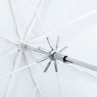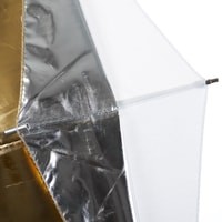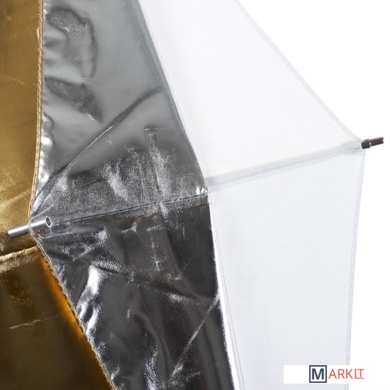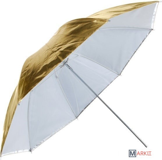 Зонт-отражатель URK-60TGS универсальный, предназначен для рассеивания света от источников освещения. В комплекте двусторонний отражатель золото/серебро и полупрозрачный рассеиватель. Данная модель позволяет комбинировать поверхности для получения 5 модификаций: просвечивающий / золотистый / серебристый / просвечивающий+золотистый / просвечивающий+серебристый. Диаметр 122 см.Просветный зонт покрыт белой полупрозрачной тканью. Световой поток от вспышки попадает на ткань зонта, максимально рассеивается и, увеличивая площадь излучения, равномерно освещает объект съемки. Таким образом, резкий точечный свет, излучаемый при срабатывании фотовспышки, преобразуется в достаточно мягкий световой поток, излучаемый с большей площади. Серебристая поверхность зонта дает более жесткий, по сравнению с белыми зонтами, свет, что позволяет получать контрастное изображение с четкими тенями. Золотистая поверхность придает отраженному свету теплые золотистые тона, часто используется в портретной съемке в качестве моделирующего или контрового источника (например, для того чтобы подчеркнуть теплым светом очертания фигуры).Возможно использовать сочетания поверхностей (просвечивающей и отражающих серебристой/золотистой) для усреднения формируемого эффекта - получения более контролируемого и направленного света (чем при использовании просвечивающей поверхности), и менее контрастного мягкого (чем при использовании серебристой/золотистой поверхности)Прочные эластичные спицы из стекловолокна и соединительные элементы из ударопрочного пластика для долговечного использования - спицы не ржавеют, сохраняют форму на протяжении всего срока эксплуатации, устойчивы к механическим воздействиям. Ткань из полиэстера обладает высокой износостойкостью.