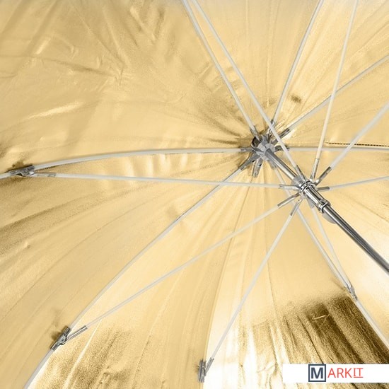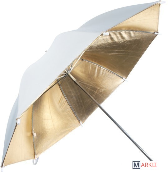 Falcon Eyes URN-48GW – двусторонний зонт: золотистый /белый отражающий. Диаметр 90 см.Золотистая поверхность придает отраженному свету теплые золотистые тона, часто используется в портретной съемке в качестве моделирующего или контрового источника (например, для того чтобы подчеркнуть теплым светом очертания фигуры).Белый отражающий зонт позволяет получить более контролируемый и направленный (по сравнению с просветным) равномерный свет и мягкие тени. Не искажает цветовую температуру источника освещения.Прочные эластичные спицы из стекловолокна и соединительные элементы из ударопрочного пластика для долговечного использования - спицы не ржавеют, сохраняют форму на протяжении всего срока эксплуатации, устойчивы к механическим воздействиям. Ткань из полиэстера обладает высокой износостойкостью.