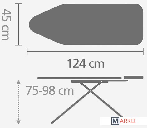 одель с широкой рабочей поверхностью – быстрое и удобное глажение (124х45 см).Отсутствие деформации и прогибов сетки – запатентованная конструкция.Регулировка по высоте в 7 положениях (75-98 см).Прочная подставка подходит для паровых систем и утюгов (макс. 40x22 см).Чехол из 100% хлопка с упругой подкладкой.Идеально натянутый чехол – затягивающий шнур с фиксатором + стяжки.Устойчивая столешница – прочный каркас на 4 ножках (диаметр 25 мм).Защитные нескользящие колпачки – устойчивость и защита от царапин.Предохранительный фиксатор от случайного складывания доски.Фиксации доски в сложенном положении.
