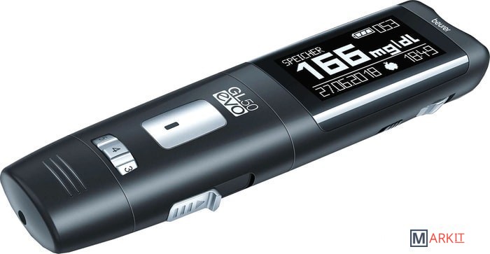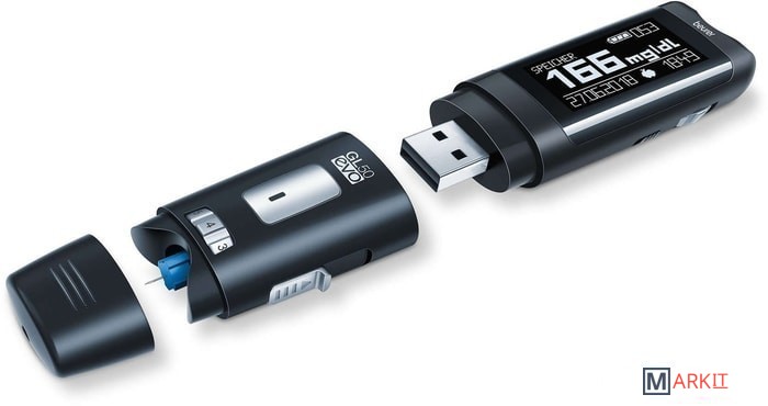 Особенности прибора: Уникальная конструкция 3-в-1:- измерительный модуль,- прокалывающее устройство,- модуль передачи данных и зарядки аккумулятора.Озвучивание результатов.Особенности измерения:- 0,6 мкл - маленькая капля крови – нужен минимальный прокол,- 5 секунд - быстрое измерение,- GDH-FAD – фермент для максимальной точности,- маркировка измерения (до еды, после еды, общее),- предупреждение о кетонах.Особенности передачи данных:- в приложение HealthManager в смартфоне через Bluetooth,- в программное обеспечение Beurer HealthManager для ПК через USB - разъем,- возможность пересылать данные из приложения или ПО врачу,- бесплатные онлайн-консультации врача-терапевта 1 категории – проект «Доктор Beurer» (для владельцев медицинских диагностических приборов Вeurer c функцией передачи данных).Особенности расходных материалов:- 18 месяцев - срок хранения открытых тест-полосок,- тест-полоски в индивидуальной упаковке (50 штук) или во флаконах (25 шт.*2) на выбор,- стерильные ланцетные иглы G28 и G33 (универсальные – подходят для ланцетных устройств всех производителей),- стерильные ланцетные иглы G33 Soft Touch – деликатный прокол для чувствительной кожи.