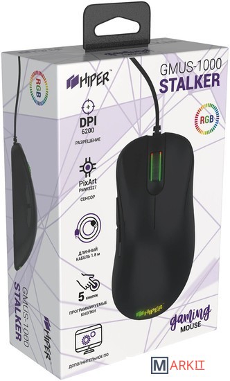 Игровая мышь HIPER STALKER (GMUS-1000) отличный вариант для любителей жанров FPS/TPS, Action и RTS. Разрешение сенсора 6000 dpi даёт возможность моментально реагировать на любые изменения в игровом процессе. Частота опроса 1000 ГЦ обеспечивает высокую скорость отклика устройства.Модель отличается эргономичным дизайном и подходит для использования правой рукой. Длины USB -кабеля для подключения (1,8 метра) хватит для комфортного использования мыши.Устройство обладает 5 программируемыми кнопками, которые можно настроить с помощью специального ПО.Модель также отличается яркой RGB подсветкой.