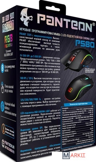 При переключении уровня DPI изменяется цвет подсветки на однотонный, соответствующий выбранному уровню DPI, на 2 секунды, затем подсветка продолжает работать в установленном ранее режиме.Фирменное программное обеспечение позволяет тонко настраивать мышь, а также записывать макросы для всех кнопок мыши.