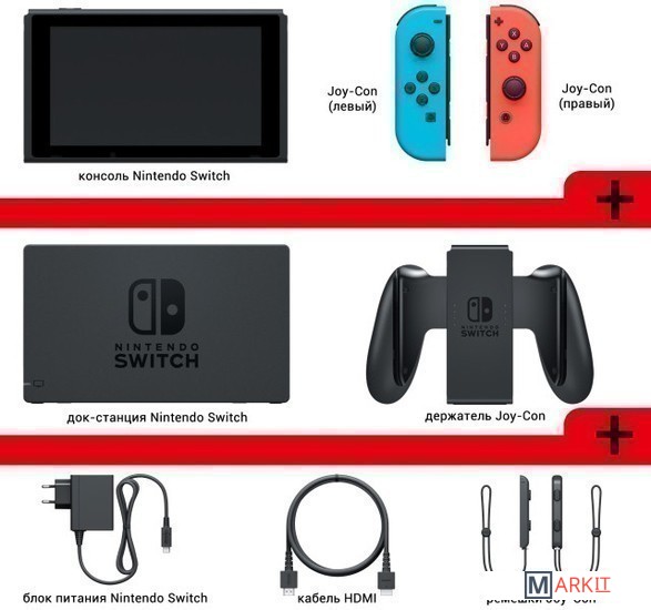 • консоль Nintendo Switch;• Joy-Con (левый) и Joy-Con (правый);• док-станция Nintendo Switch;• держатель Joy-Con;• 2 ремешка для фиксации Joy-Con на руках;• HDMI-кабель;• блок питания.