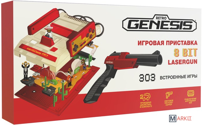 Стационарная игровая приставка Retro Genesis 8 Bit Lasergun – это выполненная в классическом полноразмерном корпусе Famicom, предназначенная для подключения к телевизору. Приставка оснащается световым пистолетом, двумя проводными джойстиками и позволяет прямиком из коробки играть в игры, предназначенные для игры вдвоем. Моментальная загрузка, а также игры с низким порогом вхождения, которые не требуют долгого обучения, позволяют освоить ее за считанные минуты даже игрокам, которые впервые берут игровой джойстик в руки.Модель идет в комплекте с большим световым пистолетом формы Zapper. Он позволяет играть в игры, предназначенные для пистолета: Duck Hunt, Hogan’s Alley, Wild Gunman и другие. *Пистолет работает только с кинескопными экранами ЭЛТ и не поддерживает современные ЖК телевизоры.Серия Canonic обеспечивает стабильные 60 FPS. Отсутствие задержек в играх и идеальный плавный игровой процесс – 60 кадров в секунду за счет использования аналога оригинальной электронной компонентной базы.Джойстики имеют не только кнопки A и B, но и их турбо версии, которые позволяют имитировать непрерывное нажатие. Как правило, турбо-кнопки крайне удобно использовать в играх, где необходимо постоянно нажимать на одну из кнопок. Например, в аркадных шутерах или скролл-шутерах, где необходимо постоянно поддерживать огонь из орудий персонажем игры. Длина провода джойстиков составляет 1,5 метра.Сборник игр включает в себя 120 игр на двоих, в которых, в зависимости от условий игры, можно играть сразу вдвоем или по очереди. 108 бестселлеров, которым присвоен рейтинг в 3 звезды, и игр, которые вошли в золотой фонд памяти видеоигр. Среди них такие хиты, как Super Mario Bros., Adventure Island Hudson's, Танчики, Черный плащ, Чип и Дейл, Арканоид, Contra, Кот Феликс, Mappy, Ninja Turtles, Tiny Toon Adventures и другие.По бокам корпуса приставки присутствуют отсеки для крепления джойстиков для более удобного хранения.Питание устройства осуществляется через разъем питания microUSB, который на данный момент является универсальным стандартом, поэтому является легко заменяемым.Для большей аутентичности рекомендуется подключение к кинескопным экранам, на которых изображение выглядит наиболее привлекательно.Особенности:Классическая форма корпуса «Famicom» со знакомыми узнаваемыми элементами – отсеками для хранения джойстиков, рычаг для легкого извлечения игровых картриджей и крышкой отсека картриджей, который предохраняет его от попадания излишней пыли или крошек.Световой пистолет Zapper (работает с кинескопными экранами).303 встроенные полноценные игры, включая для пистолета, самых разнообразных жанров. Никаких повторов или вариантов 9999-в-одном. Восхитительный сборник игр, который включает такие хиты как Super Mario Bros., Adventure Island Hudson's, Танчики, Черный плащ, Чип и Дейл, Арканоид, Contra, Кот Феликс, Mappy, Ninja Turtles, Tiny Toon Adventures и другие. В сборник включены 120 игр на двоих.Серия Canonic: игры идут в полноценных 60 кадрах в секунду без задержек.Быстрый выход в раздел выбора встроенных игр с помощью кнопки Reset. Моментальная загрузка. Совместимость с игровыми картриджами для Dendy и NES. Питание от стандартного адаптера 5V с разъемом microUSB.Турбо аналоги кнопок A и B, которые обеспечивают многократное нажатие на кнопку. Это позволяет нажать один раз на одну кнопку, чтобы постоянно производить выстрелы или прыгать. В некоторых играх это крайне удобно и позволяет сохранить рес