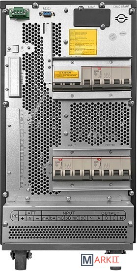 ИБП с двойным преобразованием 15 кВА/ 15 кВт, фаза 3:3, без встроенных АКБ, ЗУ 7А напряжение АКБ ±216/228/240/252/264 VDC (36/38/40/42/44 АКБ), клеммный терминал, SNMP слот, RS232