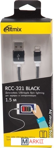 Ritmix RCC-321 – кабель для зарядки и синхронизации. Отличается высоким качеством исполнения и быстротой передачи данных. На концах кабеля два коннектора: USB-Apple 8pin lightning и USB 2.0.