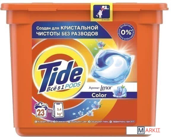 Tide PODs ВСЁ в 1— это потрясающая эффективность всего в одной капсуле. Кристальная чистота и никаких следов. Каждая капсула состоит из 3 секций — таким образом, ее ингредиенты не смешиваются до начала стирки. При контакте с водой специальная инновационная пленка растворяется, и капсула начинает свое действие: очищает, удаляет пятна, придает яркость/защищает цвет и освежает; она эффективна уже при 20 °С. Одной капсулы хватает, чтобы полностью выстирать полный барабан грязных вещей. Tide PODs ВСЁ в 1 — это надежный выбор для удивительно эффективной стирки. Используйте вместе с кондиционерами Lenor, которые придают белью еще больше мягкости и свежести.