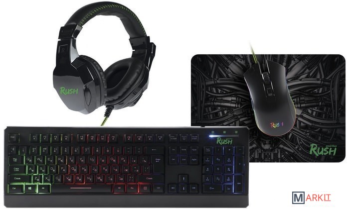 клавиатура + мышь с ковриком + наушники |