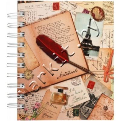 | Формат А6+ (120 x 150 мм). Обложка изготовлена из твердого картона, матовое ламинирование, выборочный УФ-лак. Внутренний блок - бумага белая офсетная, печать - серое графление. Переплет на гребне сбоку. |